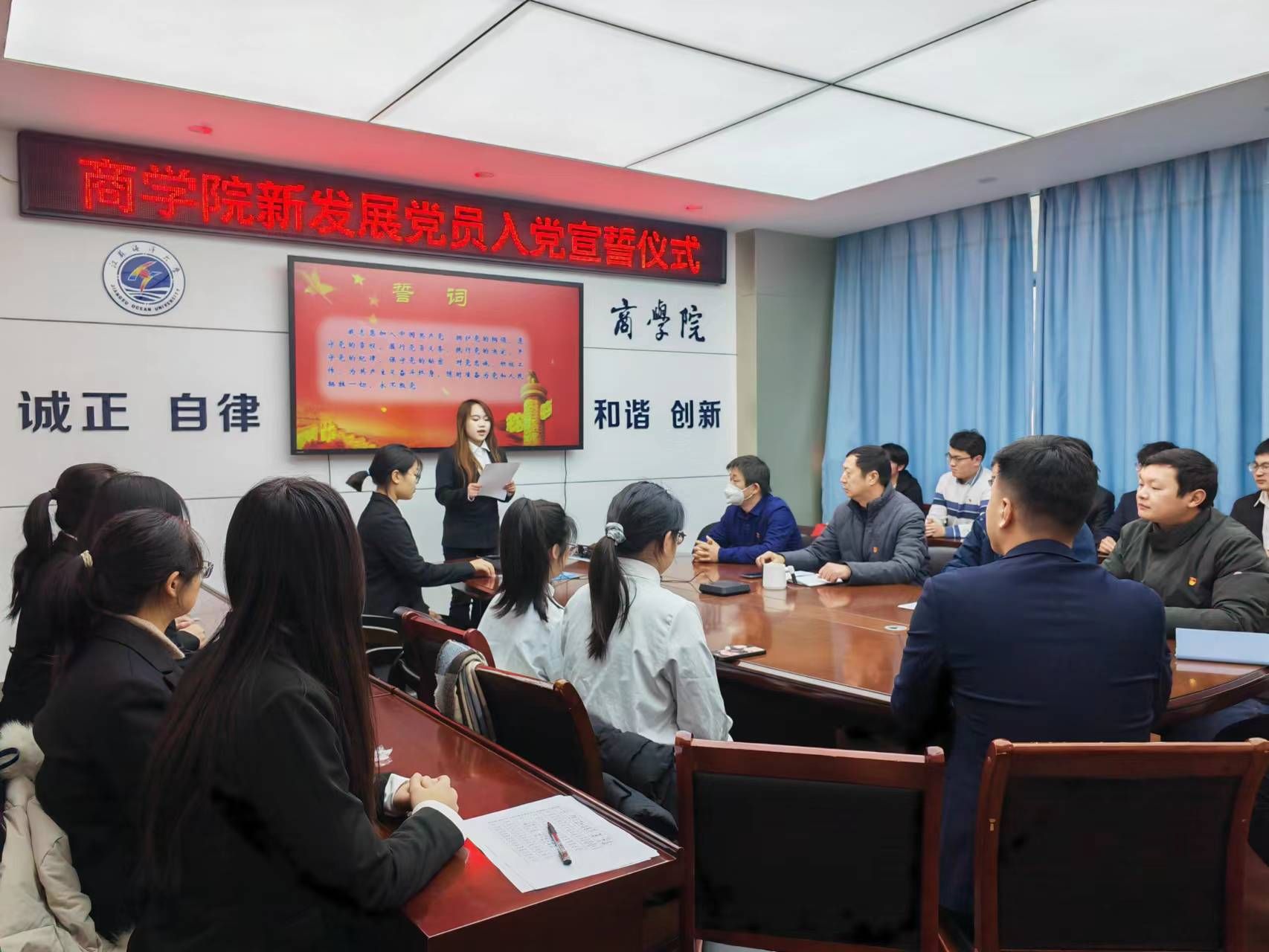 1月4日,商学院党委在文渊北楼355举行了新发展党员入党宣誓仪式,商学院党委书记万金店、副院长翟仁祥、党支部书记周智超、谭鑫、孙佳荀、杨舒翔参加,院党委副书记王智金主持仪式。
