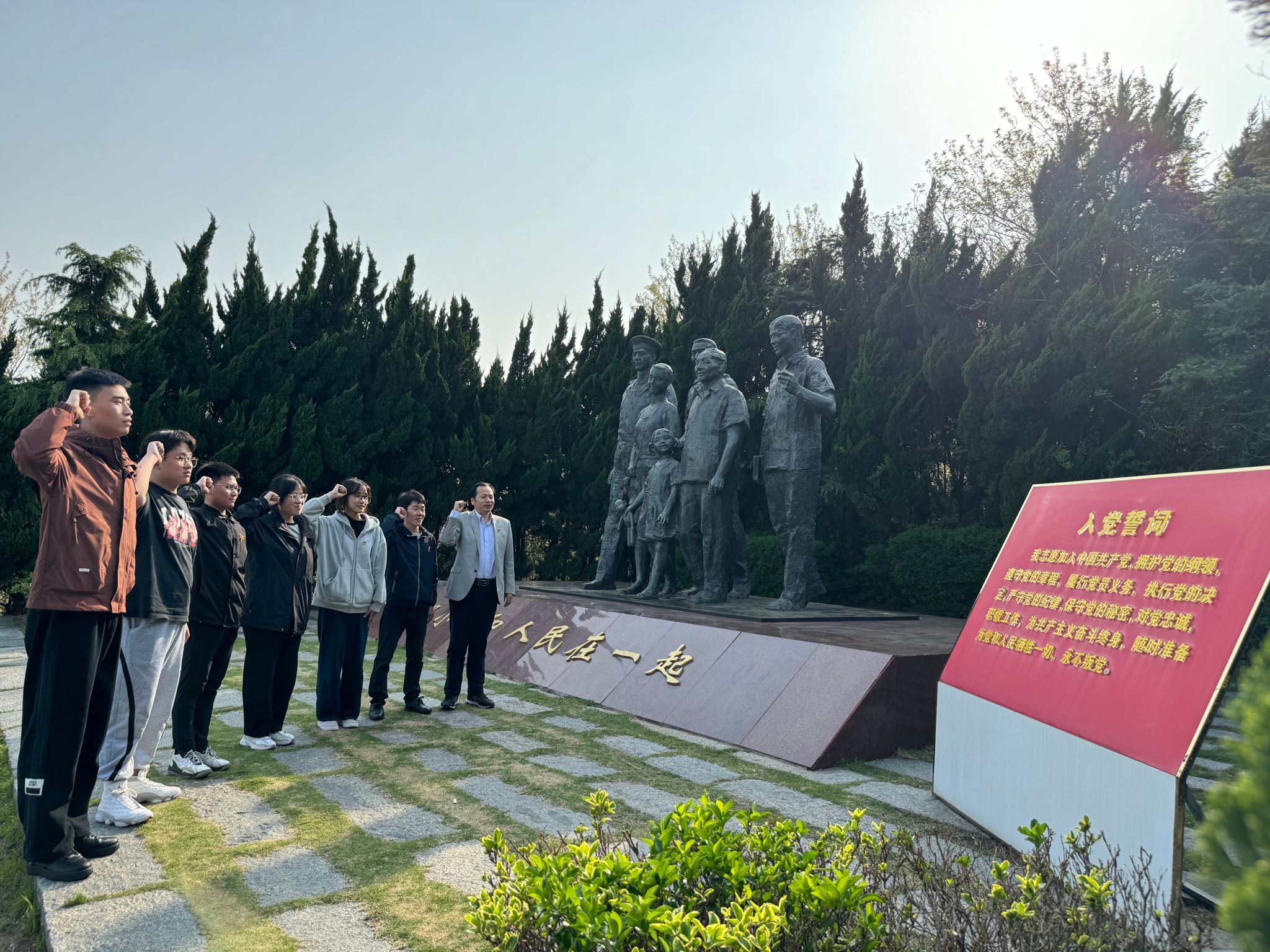 在“邓小平和人民在一起”雕塑公园,全体党员和师生在讲解员的介绍引领下,依次瞻仰参观,重温伟人伟绩。全体学生党员在雕像前,高举右拳,庄严宣誓,重温入党誓词,表示要坚持不懈用习近平新时代中国特色社会主义思想凝心铸魂,弘扬伟大建党精神、以坚定的理想信念砥砺对党的赤诚忠心。