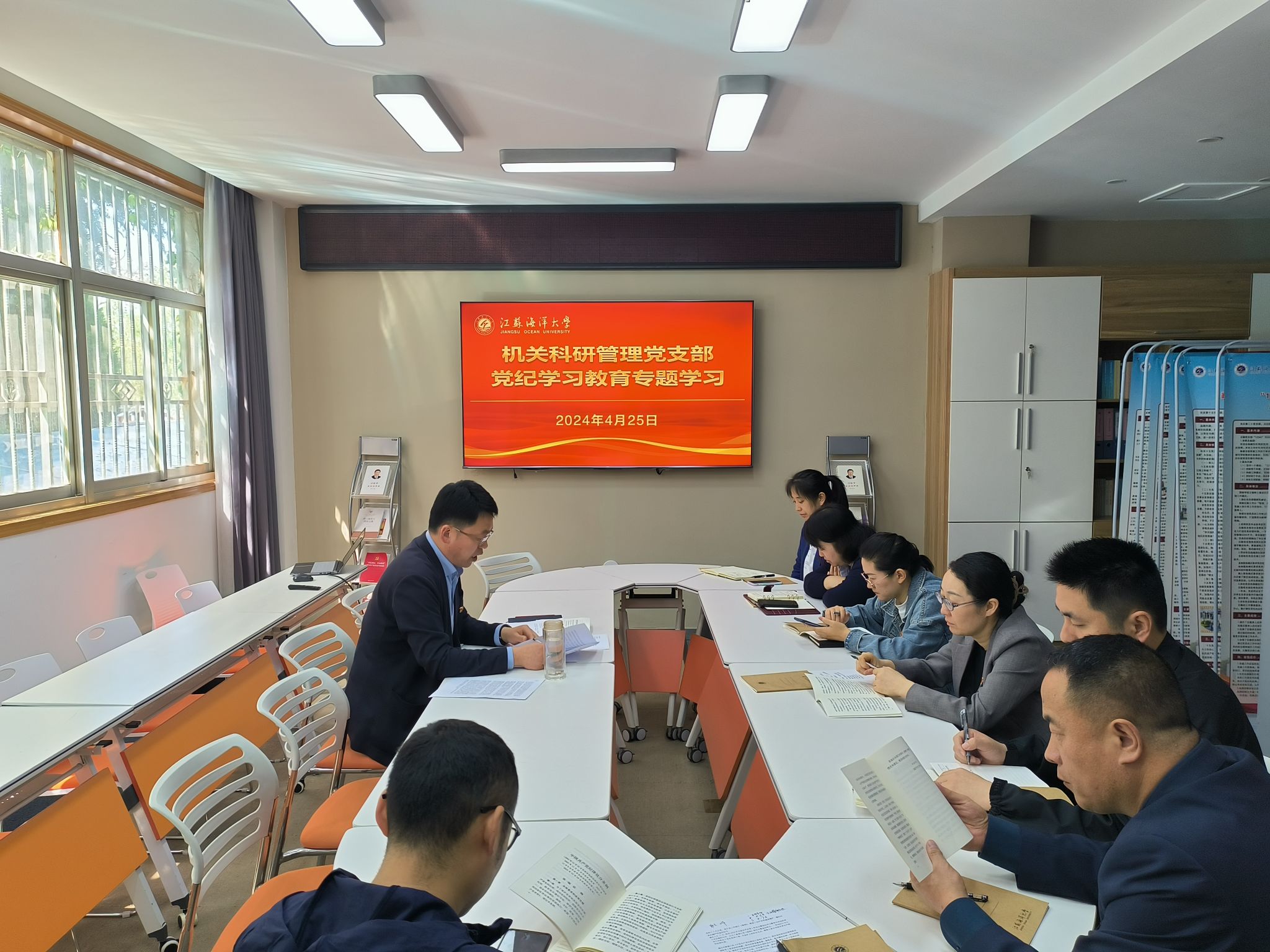 4月25日,机关科研管理党支部在行政楼一楼会议室召开党纪学习教育专题学习会,认真对照《中国共产党纪律处分条例》(以下简称《条例》),坚持实事求是、求真务实,聚焦目标任务进行深入学习。支部书记、科学技术处处长戴红伟主持会议,支部全体人员参会。