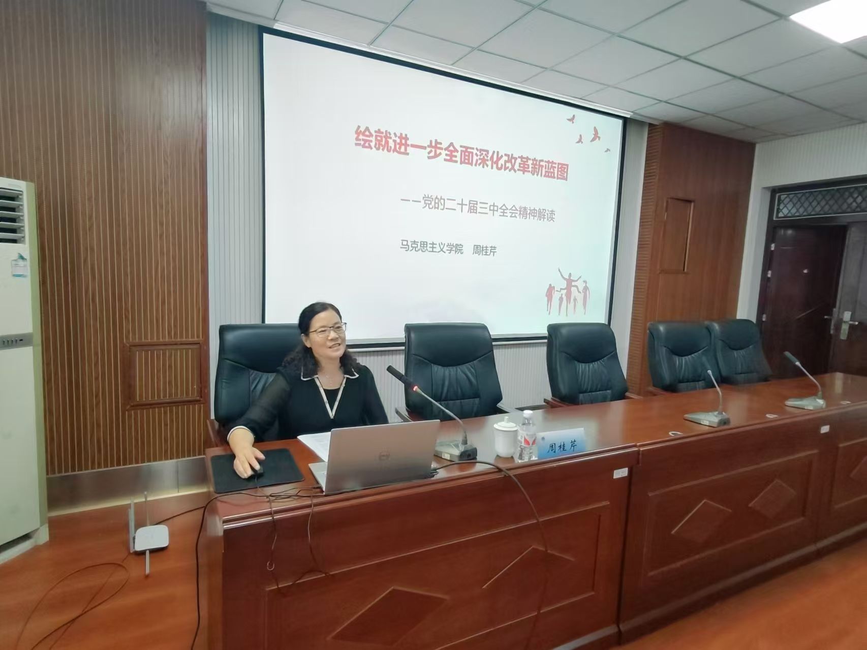 会上,周桂芹教授以“绘就进一步全面深化改革新蓝图”为题,从关键时期召开的一次十分重要的会议、深入学习领会习近平总书记在全会上的重要讲话精神、全面准确理解《决定》提出的进一步全面深化改革重要举措、全力抓好全会精神的学习贯彻落实等四个方面作了系统宣讲和深入阐释,通过此次报告会使参会人员对党的二十届三中全会精神有了更深层次理解。