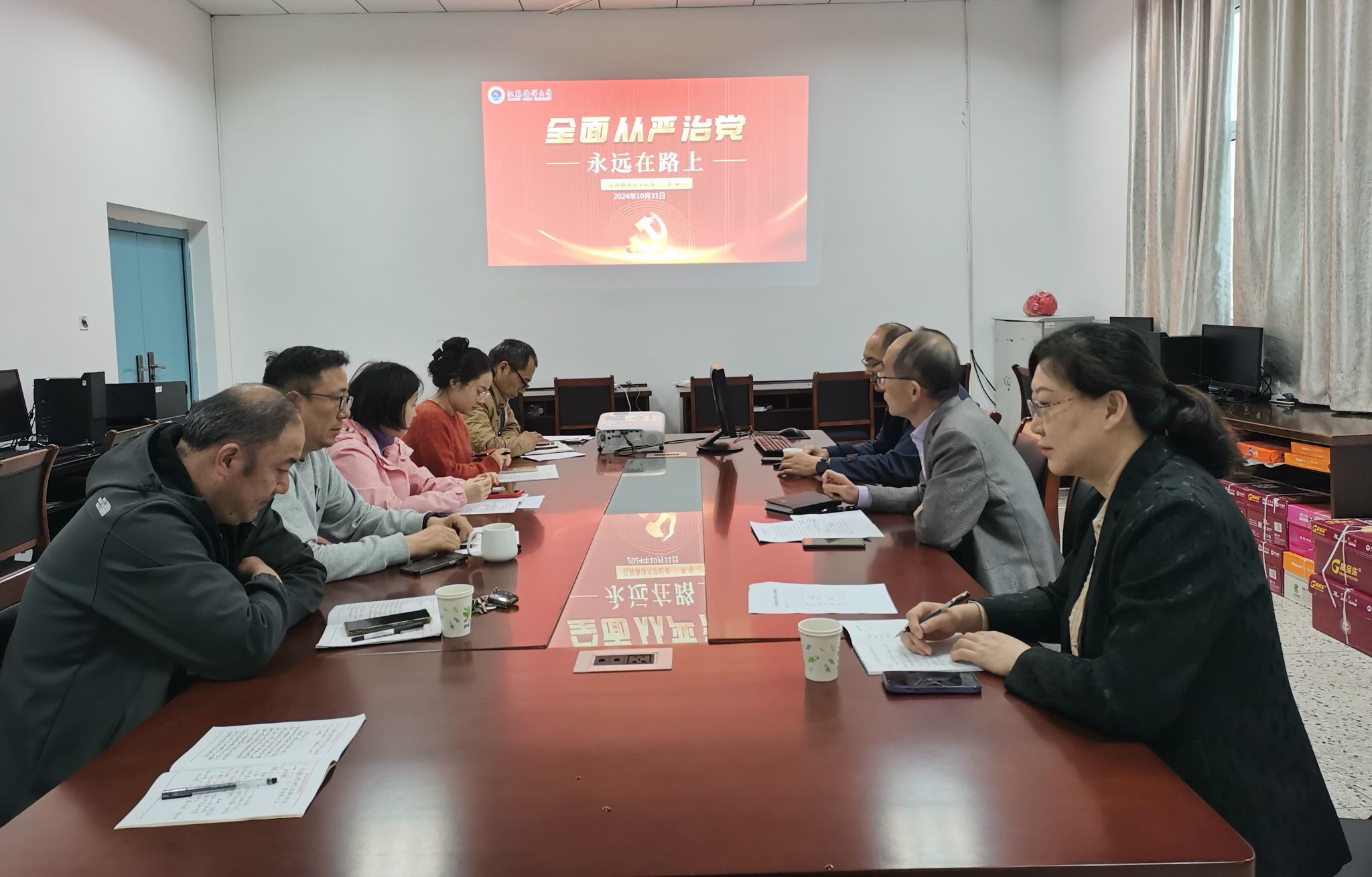 为巩固深化党纪学习教育成果,纵深推进全面从严治党,10月31日下午,机关招就处党支部召开党风廉政警示教育专题辅导报告会,会议邀请学校纪委副书记李春作题为“全面从严治党—永远在路上”的专题讲座,机关招就处党支部书记马恒通主持报告会,支部全体党员参加学习。