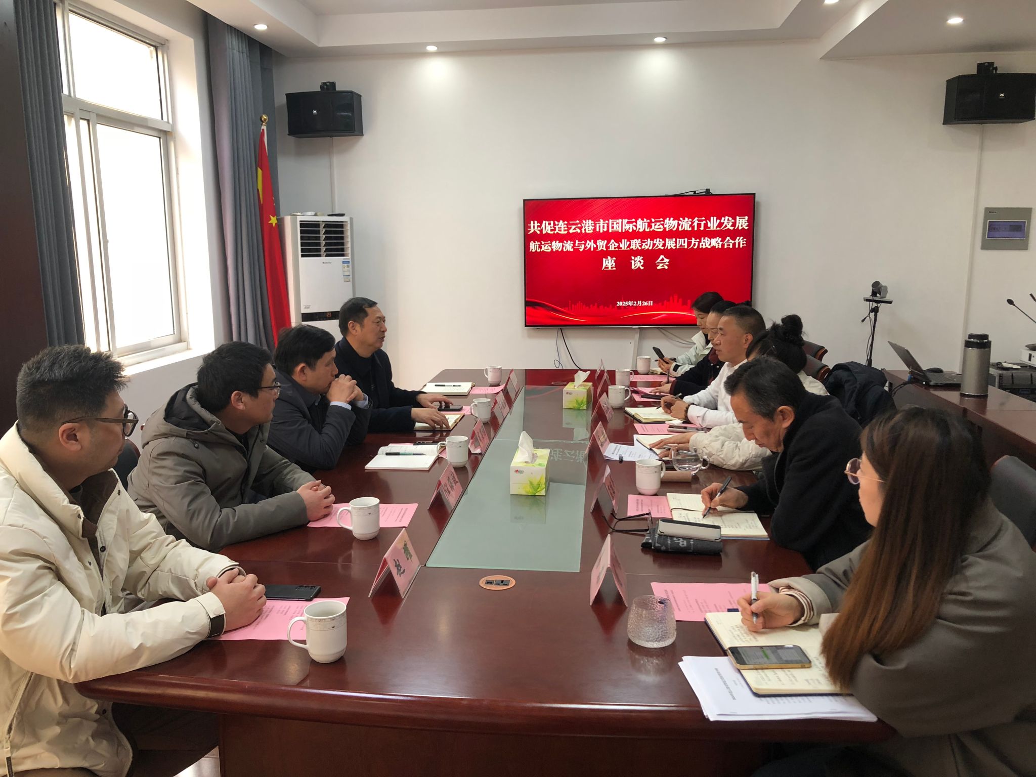 2月26日,江苏海洋大学商学院、连云港市哲学社会科学界联合会、连云港市贸促会、连云港市国际航运物流协会四方齐聚连云港市贸促会会议室,举行党建联建座谈会。此次座谈会旨在通过党建引领,凝聚各方力量,促进资源共享与优势互补,共同探索党建与物流行业融合发展新路径。