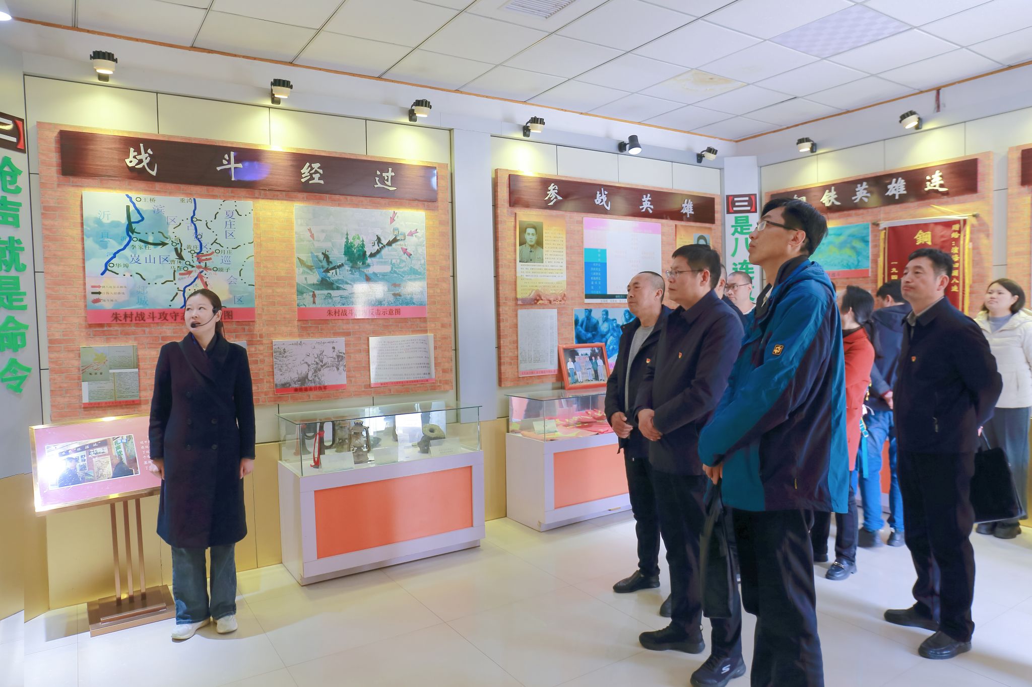 缅怀革命先烈,回首峥嵘岁月。在朱村抗日战斗纪念馆内,讲解员带领全体党员依次瞻仰了“烽火岁月”“英雄朱村”“红色传承”等主题展厅,通过珍贵的历史照片、实物展陈和场景复原,大家深入了解朱村战斗的激烈过程与军民鱼水情深的感人故事,深刻感受到革命先烈不畏牺牲、保家卫国的崇高精神。