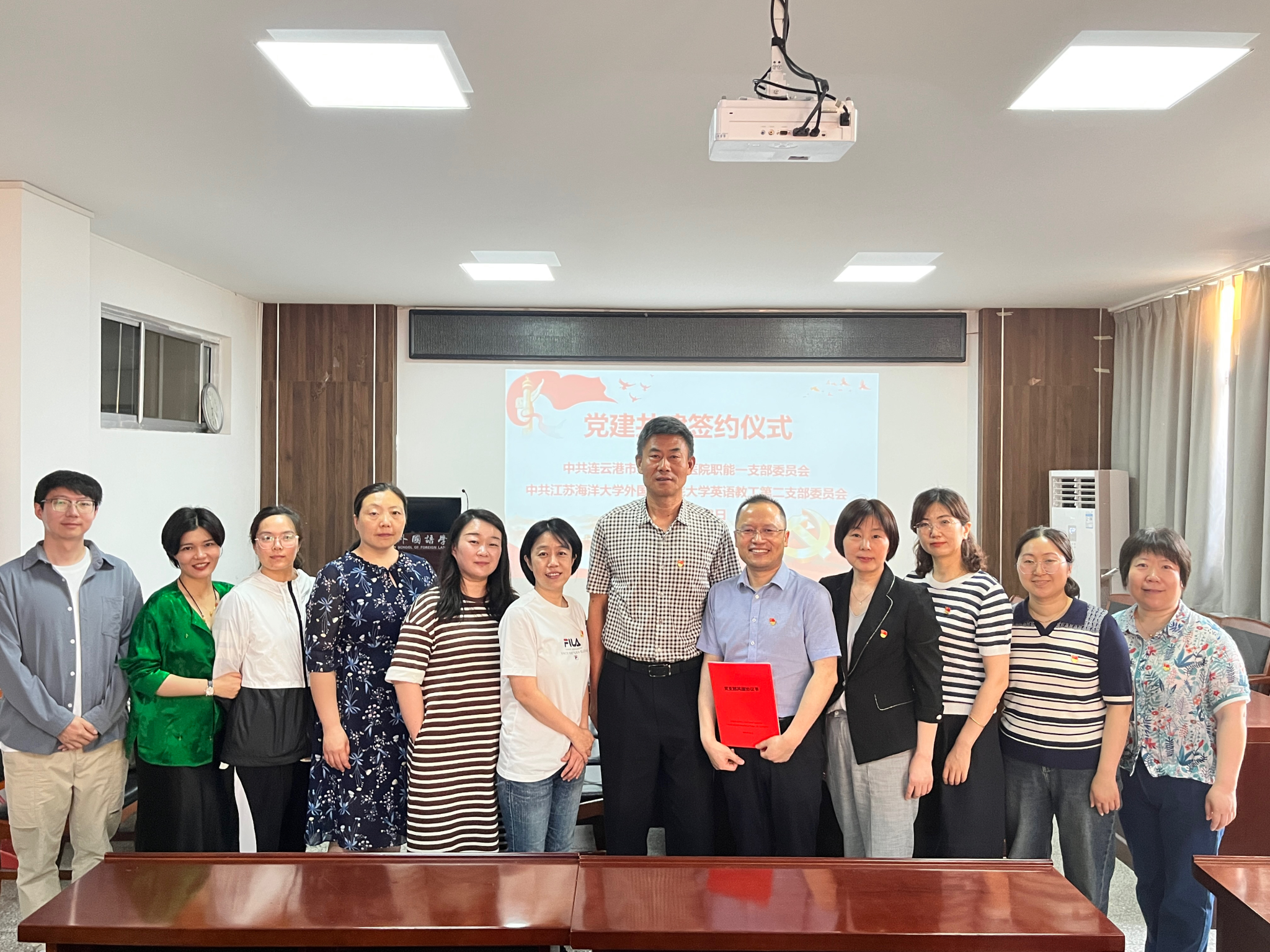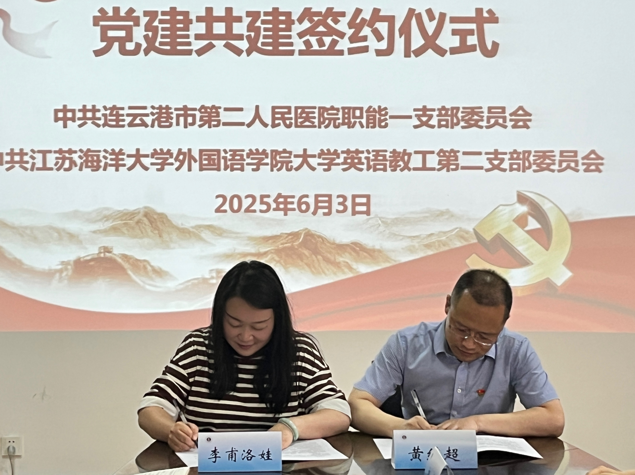 外国语学院党委书记田德勇同志对连云港市第二人民医院职能一党支部成员的到来表示热烈欢迎,双方支部书记分别介绍了各自支部的基本情况、党建特色及业务优势,并共同期待双方以党建为纽带,充分发挥各自优势,开启合作共赢新局面。江苏海洋大学外国语学院大学英语教工第二党支部书记李甫洛娃与连云港市第二人民医院职能一党支部书记黄继超代表双方支部签署了党建共建协议。