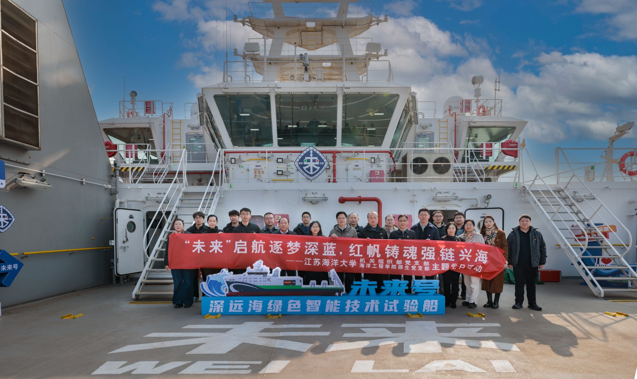 3月10日下午,机关组织部党支部联合海洋工程学院教师、学生党支部,携手深海技术科学太湖实验室连云港中心、连云港市科技局,在“未来”号深远海绿色智能技术试验船开展“‘未来’启航逐梦深蓝·红帆铸魂强链兴海”联合主题党日活动。本次主题党日活动以学校“蓝海红帆・强链兴海”行动为指引,旨在搭建“机关—学院—科研单位”共建平台,推动组织联建、资源联享、发展联促。副校长金芙蓉、农春仕,科学技术处、海洋科学与水产学院、机械工程学院、电子工程学院相关负责人共同参加活动。