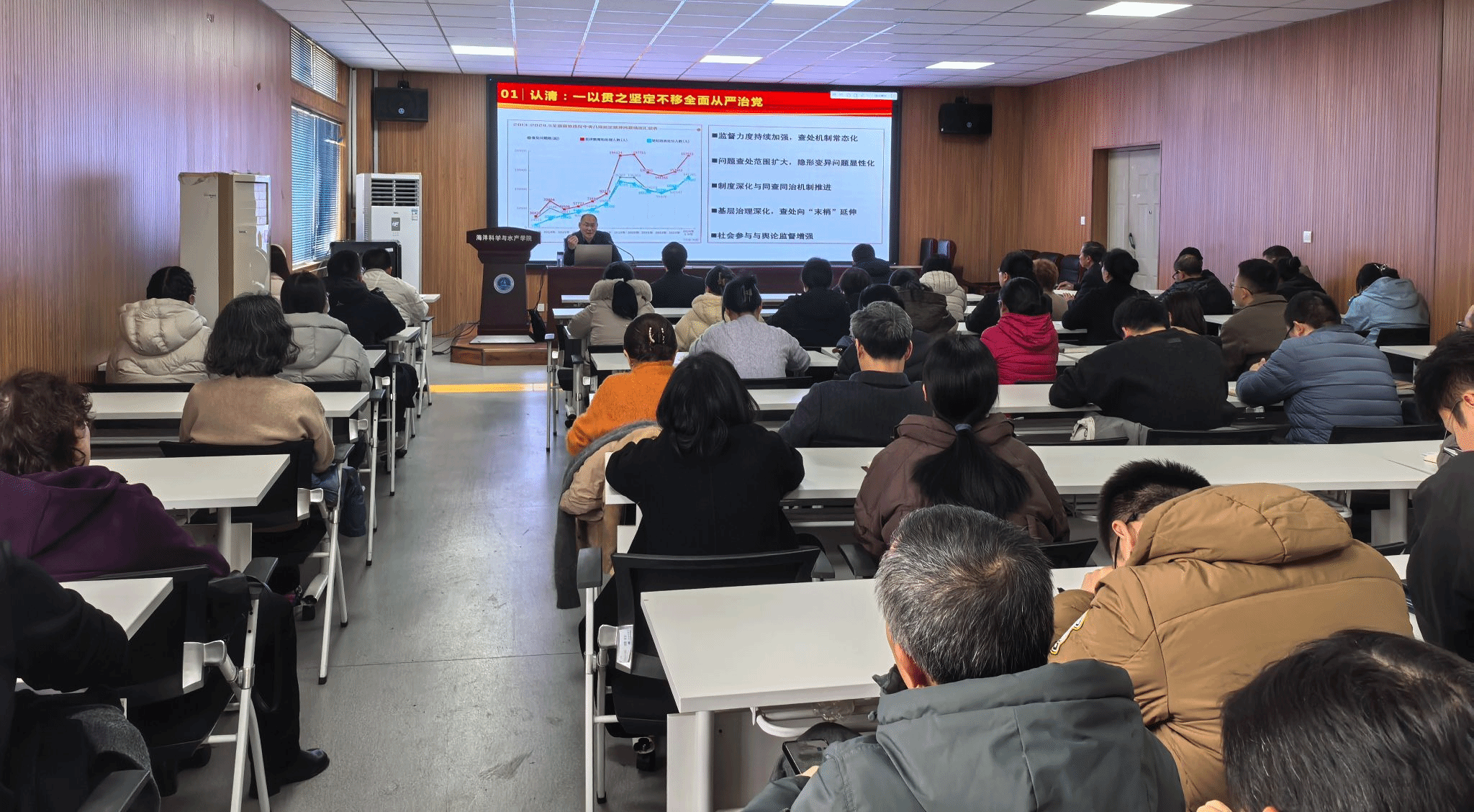 为切实加强党风廉政建设,引导广大教师坚守为党育人、为国育才的初心使命,营造崇尚师德、廉洁从教的良好氛围,3月18日下午,海洋科学与水产学院邀请校纪委副书记李春为全院教职工作“筑牢师德防线 涵养清风正气”专题辅导报告。学院党委书记黄金虎主持报告会。