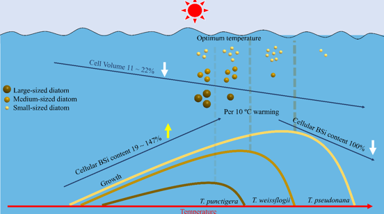 据范佳乐介绍,实验硅藻广泛分布于全球海洋中,在海洋生物碳泵以及碳和硅等元素的生物地球化学循环中发挥着不可替代的作用。他通过研究发现,硅藻的细胞体积每增加一个量级,最适生长温度、最大生长速率和热生态位宽度将相应减少一定比例。这项研究结果有助于预测在未来升温和营养限制的背景下,海洋硅藻群落结构将从大粒径物种向小粒径物种转变,从而对海洋碳泵和硅的生物地球化学循环产生深远影响。