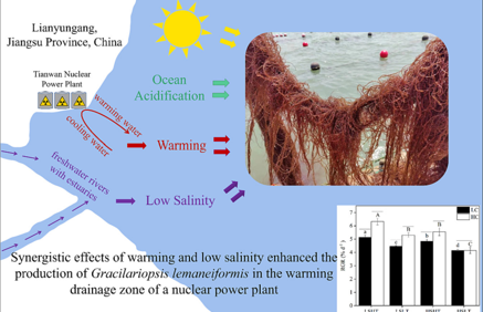 2021级硕士研究生陈泽宇在导师周伟博士的指导下在Aquaculture(中科院1区Top期刊,IF=4.5)上报道了核电温排水区域大型经济海藻栽培的研究成果。研究揭示了不同温度、盐度和CO2浓度对龙须菜栽培的影响,证实了核电站温排水海域适宜大型海藻规模化栽培,为实现核电站温升区的综合利用提供了有效路径,同时也为中国北方实现龙须菜的全年栽培提供了科学依据。